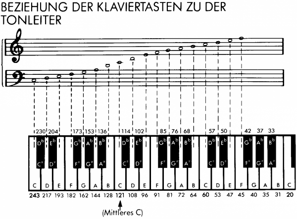 - Tonhöhe (0-255). Je größer der Wert, desto tiefer die Frequenz. Frequenz = 31960/(Tonhöhe + 1) siehe Tabelle.