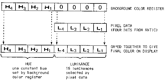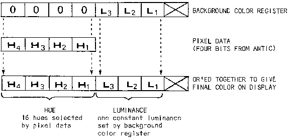 In Assembly Language use the OS shadow for the background color register $2C8 to set the luminance in the lower four bits with hex values from $0 to $F. If CIO calls are used, store the pixel data into ATACHR located at $2FB. This selects the hue with hex values from $0 to $F. If you are maintaining your own display data then the pixel data goes directly into the left or right half of the display RAM byte.
