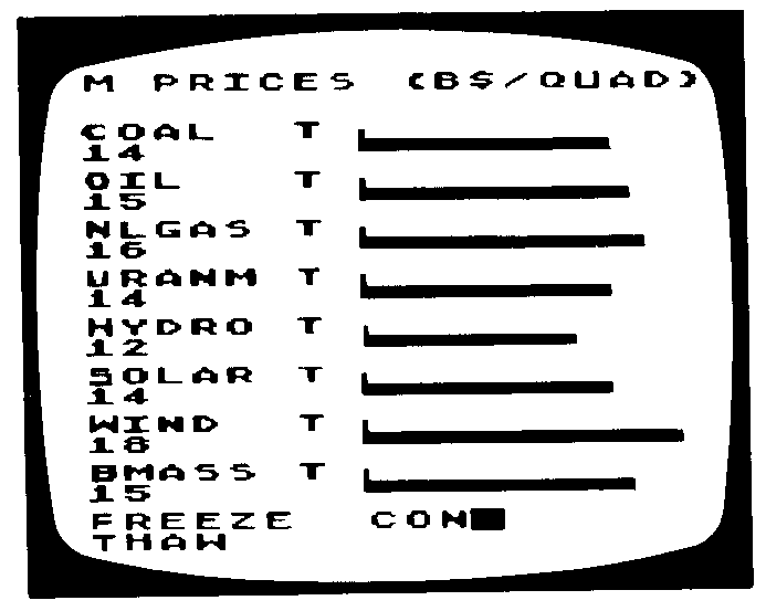 Many interesting and useful application possibilities spring from character set Indirection. The obvious application is the modified font. A different font can give a program a unique appearance. It is possible to have Greek, Cyrillic, or other special character sets. Going one step further, you can create graphics fonts. The ENERGY CZAR(TM) computer program uses a redefined character set for bar graphs. A character occupies eight pixels; tints means that bar charts implemented with standard characters have a resolution of eight pixels, a rather poor resolution. ENERGY CZAR uses a special character set in which some of the less popular text symbols (ampersands, pound signs, and the like) have been replaced with special bar chart characters. One character is a one-pixel bar, another is a two-pixel bar, and so on to the full eight-pixel bar. The program can thus draw detailed bar charts with resolution of a single pixel. Figure 3-4 shows a typical display from this program. The mix of text with map graphics is only apparent; the entire display is constructed with characters.