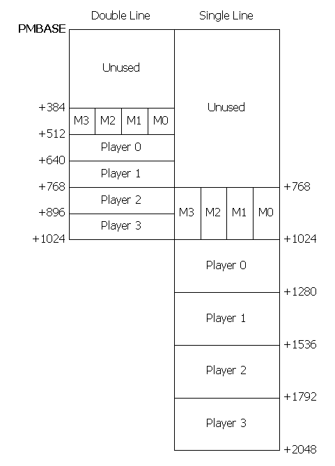 The pointer to the beginning of the player-missile area is labelled PMBASE. Because of internal limitations of ANTIC, PMBASE must be on a 2K address boundary for single-line resolution, or a 1K address boundary for double-line resolution. If you elect not to use all of the players or none of the missiles, the areas of RAM set aside for the unused objects may be used for other purposes. Once you have decided where your player-missile RAM area will be, you inform ANTIC of this by storing the page number of PMBASE into the PMBASE register in ANTIC. Note that the address boundary restrictions on PMBASE preclude vertical motion of players by modifying PMBASE.